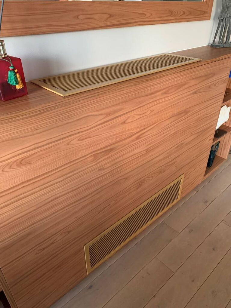 Nous avons intégré les consoles dans un meuble en bois ainsi que les le groupe extérieur qui a été caché dans un meuble maçonne.